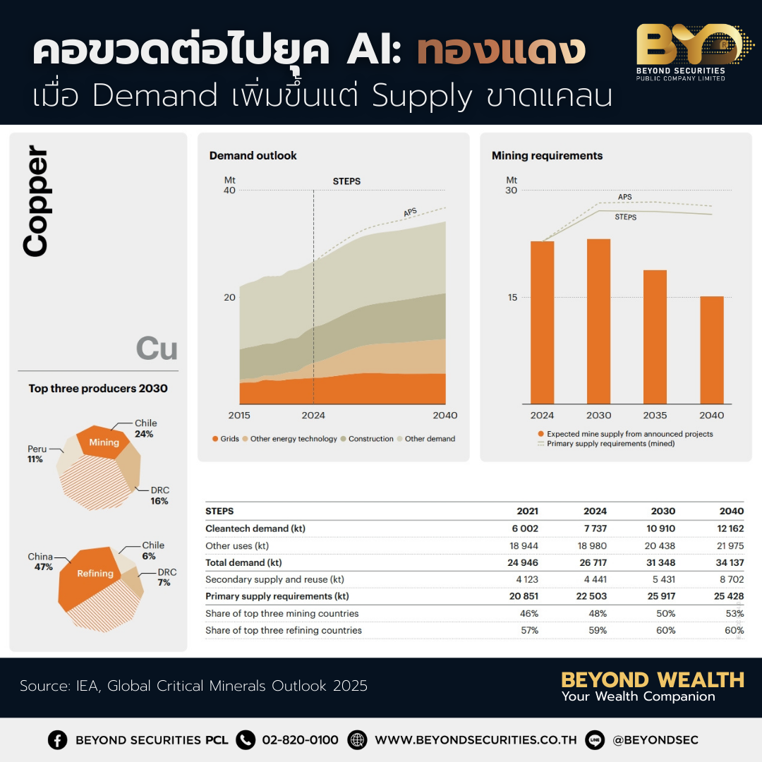 ทองแดงได้เปลี่ยนผ่านจากสินค้าโภคภัณฑ์ตามวัฏจักร สู่สินทรัพย์แห่งอนาคต เมื่อผู้ผลิตรายใหญ่เข้าใกล้จุดพีค ในขณะที่ดีมานด์จาก AI กำลังเข้าสู่ช่วง S-Curve รายงาน IEA ระบุว่า Demand และ Supply ของทองแดงมีแนวโน้มจะ “ขาดแคลน” ในอีก 5-15 ปีข้างหน้า
